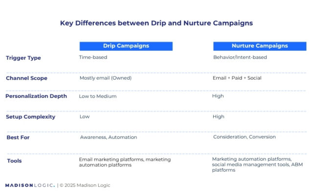 Drip and nurture campaigns serve different functions in an ABM strategy: drip scales your reach (maintaining contact with your audience) through segmented email programs, while nurture deepens engagement by incorporating buyer characteristics, intent signals, and engagement history.