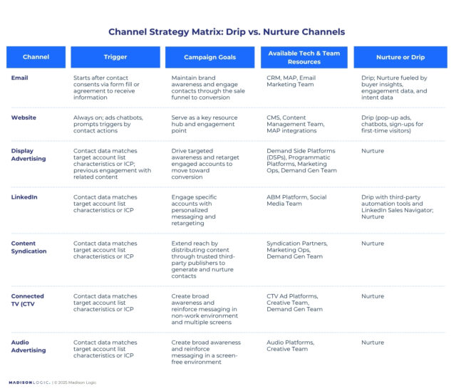 A successful nurture strategy in ABM relies on using the right channels at the right stages, distinguishing between drip campaigns that deliver steady, timed messaging and nurture campaigns that respond dynamically to buyer behavior. This matrix outlines how key channels serve as drip or nurture tools, aligned with account stages, campaign goals, technology needs, and target list sizes. Leveraging this framework enables marketers to orchestrate personalized, multi-touch engagement that guides accounts smoothly through their buying journey.