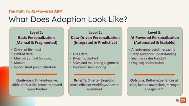 To put AI into action, begin small—test one nurture flow, experiment with trigger-based messaging, or score contacts and content dynamically. The key is starting with experiments that generate momentum, then gradually scaling across accounts, campaigns, and channels. By intentionally progressing through these levels, organizations can turn chaotic signals into a structured, actionable system that drives measurable revenue impact.