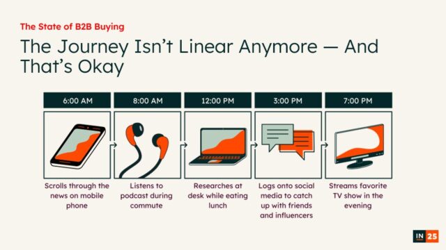 Multiply that behavior across 14-23 stakeholders in a buying group, and across dozens or even hundreds of target accounts. Your buyers aren’t moving neatly through a funnel—they’re navigating a constant stream of information, across multiple channels, often at the same time.