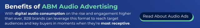 Incorporate audio ads into your ABM strategy to reach executive buyers during commute times or focused listening sessions. Whether through podcasts or streaming platforms, audio advertising can echo your core value propositions and subtly reinforce your message in a channel that feels personal and distraction-free.